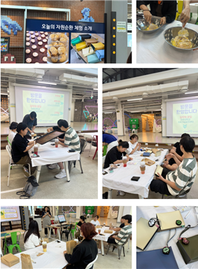 체험 활동으로는 기존의 아몬드가루 대신 비지가루를 활용한 상투과자 만들기, 선인장 껍질로 가죽 파우치 제작을 진행하였으며, 이를 통해 버려지는 자원을 재활용하여 새로운 가치를 창출하는 경험을 하였습니다.